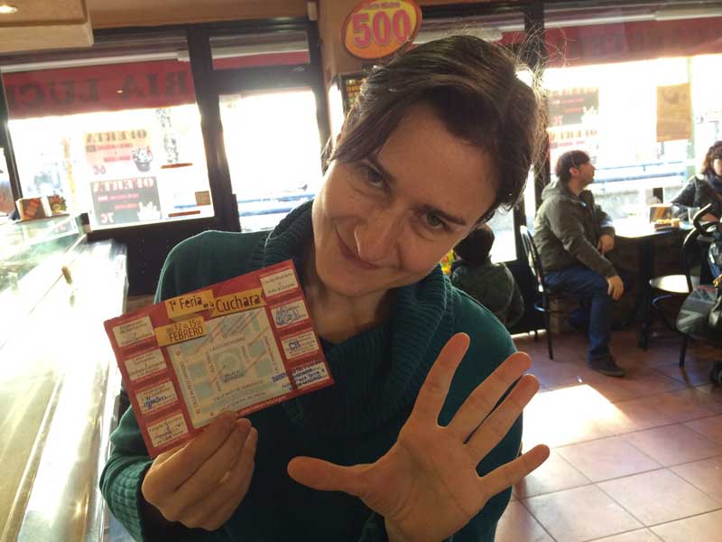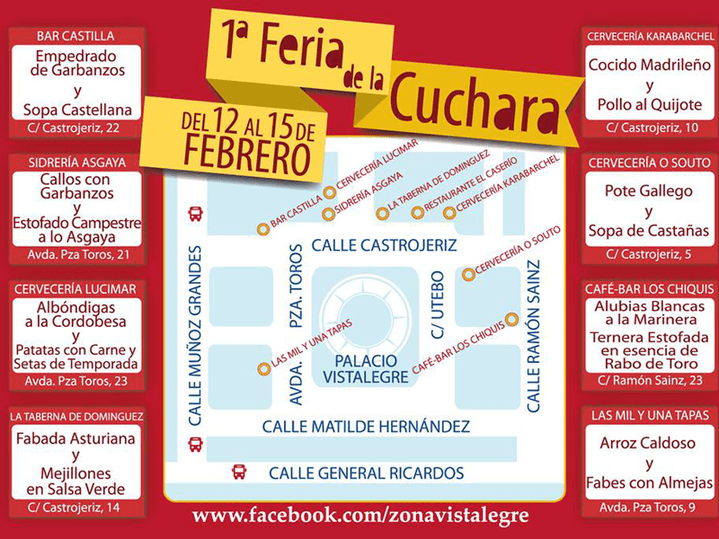 Desde el facebook de Zona Vistalegre nos hemos descargado el mapa de la Feria de la Cuchara y tenemos localizados todos los bares, además de las distintas tapas que podemos degustar en cada uno de ellos, en cada local nos ofrecen dos tapas distintas.