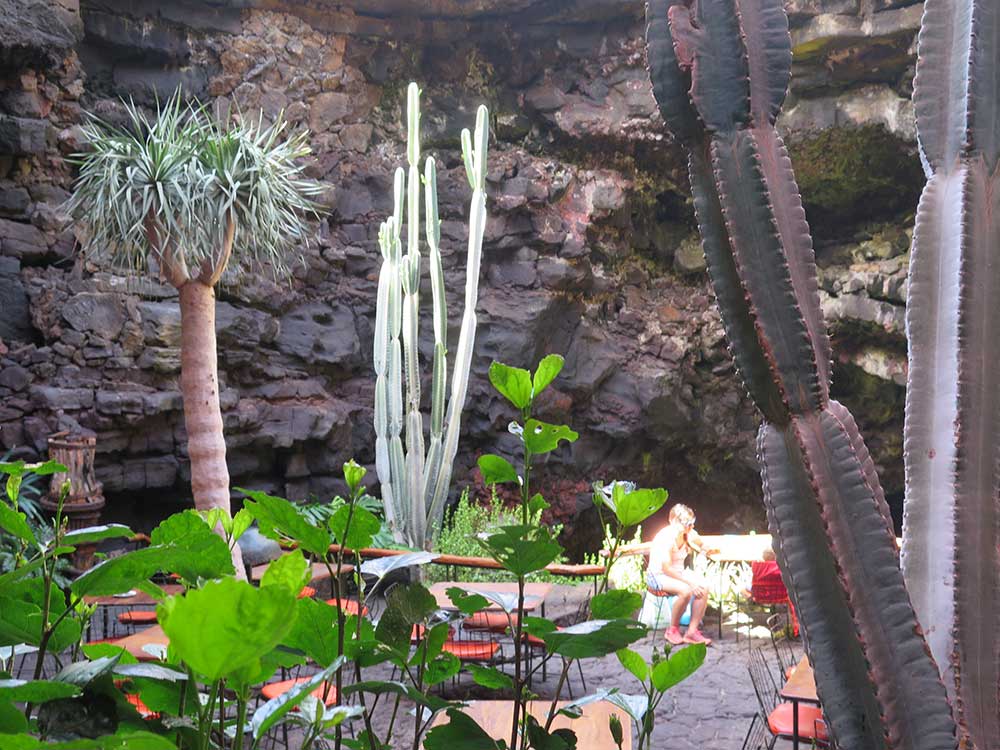 La sensación era la de estar en un especie de cápsula. Una burbuja de basalto con sonido ambiental a la que habían “puesto bonita” con helechos, cactus, opulentos elementos de jardinería, coquetas zonas habilitadas con mesas y taburetes donde comer o tomar algo, estratégicos focos de luz y hasta con un Auditorio en el que se celebran sus mágicas Noches de Jameos. 🙂